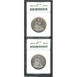 1849-O 50C AU50 ANACS, lightly toned with extensive bright luster, the right side stars are softly s