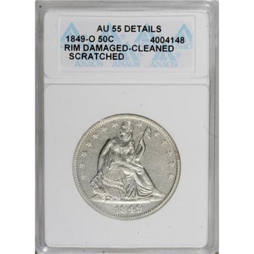 <B>1849-O 50C --Cleaned, Rim Damaged, Scratched--ANACS. AU55 Details.</B></I> NGC Census: (5/37). PCGS Population (4/24). Mintage: 2,310,000. Numismedia Wsl. Price for NGC/PCGS coin in AU55: $425. (#6263)<BR><BR><B>Coin Engraver:</B> Christian Gobrecht<BR><BR><b>Shipping:</b> Coins & Currency (<a target="_blank" href="http://www.heritageauctions.com/common/shipping.php">view shipping information</a>)
