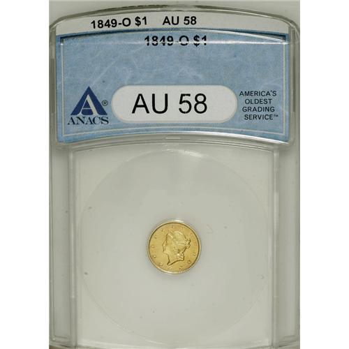<B>1849-O G$1 AU58 ANACS.</B></I> NGC Census: (131/255). PCGS Population (37/98). Mintage: 215,000. Numismedia Wsl. Price for NGC/PCGS coin in AU58: $500. (#7508)<BR><BR><b>Shipping:</b> Coins & Currency (<a target="_blank" href="http://www.heritageauctions.com/common/shipping.php">view shipping information</a>)