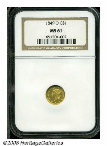 <B>1849-O<G$1> MS61 NGC.</B></I> Lustrous and attractive with light abrasions and blemishes as expected for the grade. Struck from a lapped die that is missing considerable detail from the lower reverse.