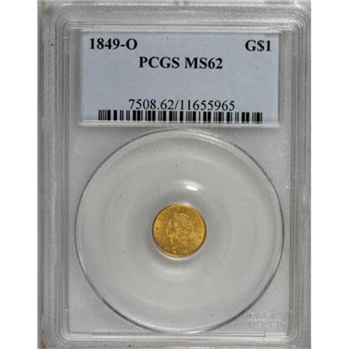 <B>1849-O G$1 MS62 PCGS.</B></I> Variety One. The obverse is crisply detailed, though the stars at the top are soft, a diagnostic for the die pair. The luminous and frosty surfaces are predominantly orange-gold, though a copper spot appears to the right of the wreath's bow. Population: 30 in 62, 53 finer (8/07).<BR><BR><B>Coin Engraver:</B> James B. Longacre<BR><BR><b>Shipping:</b> Coins & Currency (<a target="_blank" href="http://www.heritageauctions.com/common/shipping.php">view shipping information</a>)