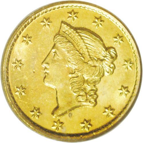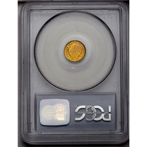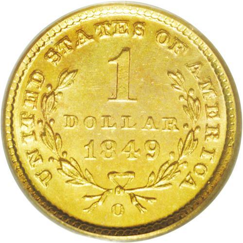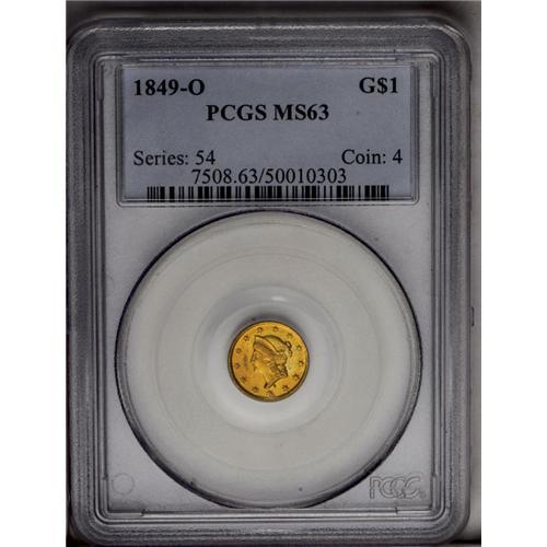 <B>1849-O<G$1> MS63 PCGS.</B></I> While the 1849 Philadelphia issue has four different subtypes, the less often seen 1849-O invariably matches Breen's Type III (With L, Open Wreath, Large Head). The present intricately struck Select example is mostly peach-gold with lilac tints across the upper reverse. Population: 24 in 63, 16 finer (5/06).