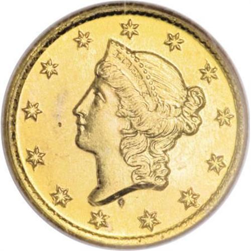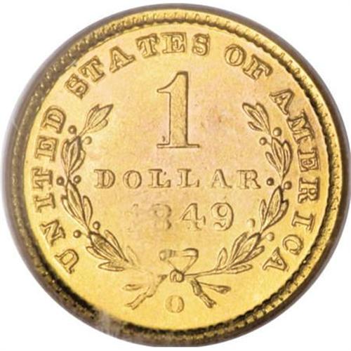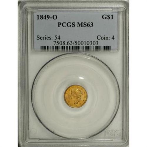 <B>1849-O G$1 MS63 PCGS.</B></I> While the 1849 Philadelphia issue has four different subtypes, the less often seen 1849-O invariably matches Breen's Type III (With L, Open Wreath, Large Head). The present intricately struck Select example is mostly peach-gold with lilac tints across the upper reverse. Population: 36 in 63, 19 finer (12/07).<BR><BR><B>Coin Engraver:</B> James B. Longacre<BR><BR><b>Shipping:</b> Coins & Currency (<a target="_blank" href="http://www.heritageauctions.com/common/shipping.php">view shipping information</a>)