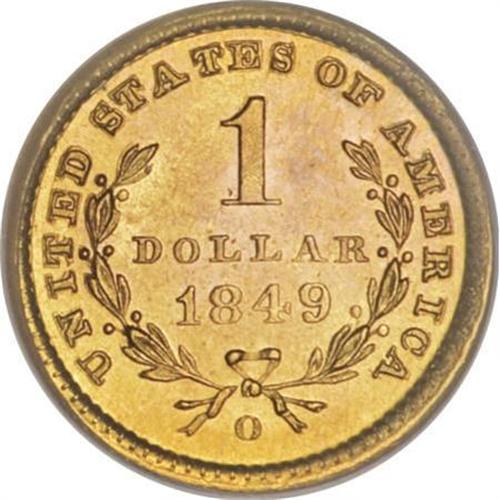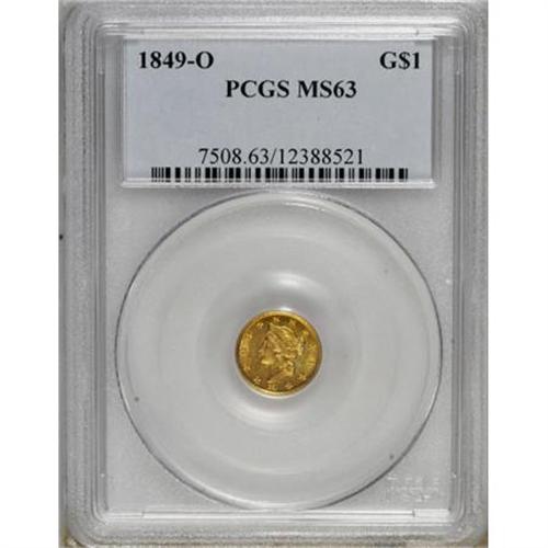 <B>1849-O G$1 MS63 PCGS.</B></I> Rich golden-orange patina dominates both obverse and reverse of this O-mint Select gold dollar, with splashes of yellow-green and purple on the former and lilac on the latter. Sharply impressed, including the reverse center, which is usually weak. Light obverse marks limit the grade.<BR><BR><B>Coin Engraver:</B> James B. Longacre<BR><BR><b>Shipping:</b> Coins & Currency (<a target="_blank" href="http://www.heritageauctions.com/common/shipping.php">view shipping information</a>)