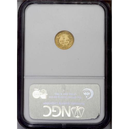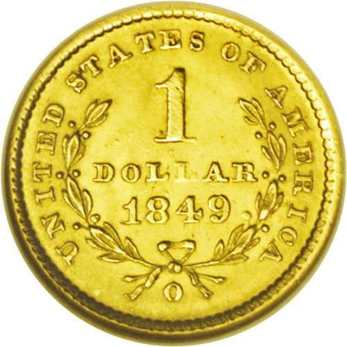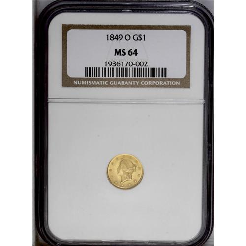 <B>1849-O<G$1> MS64 NGC.</B></I> A lustrous and deeply colored khaki-gold example with a solid strike and a few small marks that restrict the grade. An important and conditionally rare first-year piece from the New Orleans Mint. Population: 13 in 64, 4 finer (7/06).<BR><I>From The Derrick Snider Collection.</B></I>