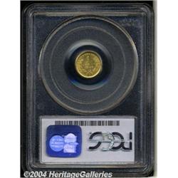 <B>1849-O<G$1> MS64 PCGS.</B></I> Extremely well struck with a full mintmark, strong date, and no weakness on the LLA in DOLLAR. The surfaces are very frosty with deep yellow-gold color, some reddish-gold can be seen at peripheral areas on the reverse. Very choice for the grade with a few small marks visible in the fields. This is certainly among the finest known 1849-O gold dollars.<BR> While common in the lower Mint State grades, the 1849-O becomes scarce in MS63 and rare in MS64. Gems are extremely rare. As of March, 2004, PCGS had graded only 12 1849-O gold dollars in MS64 with just four finer, while NGC had graded 17 in MS64 with seven better.<BR><I>From The South Florida Collection.</B></I> <BR><BR><B>Important notice:</B> Heritage usually auctions material at the rate of 200-250 lots per hour. On some occasions eBay Live bid software or the Internet may not be able to keep up with the pace of the auction. We recommend placing a realistic absentee bid now as insurance to avoid disappointment. Occasionally the auctioneer may eliminate or reject an eBay Live bid, and the auctioneer may also reopen a lot after the close of the eBay live bidding (usually because we missed an audience bid), and may reject your bid even if it shows you as the winning bidder. By bidding via eBay Live, you agree that Heritage may award the lot to another bidder at its sole discretion under the circumstances described above or any other reasonable circumstances. Since eBay bids are not shown to us until we open the lot on the floor, we treat those bids just like floor bids. In most cases the floor responds before the eBay bid is presented to us, due to Internet lag time, so for consistency we have made it a policy that floor bids are always considered first over tie eBay live bids. Also please note that all Heritage lots purchased through eBay Live carry a 20% Buyer's Premium. Please make sure you read the Terms and Conditions before you bid.