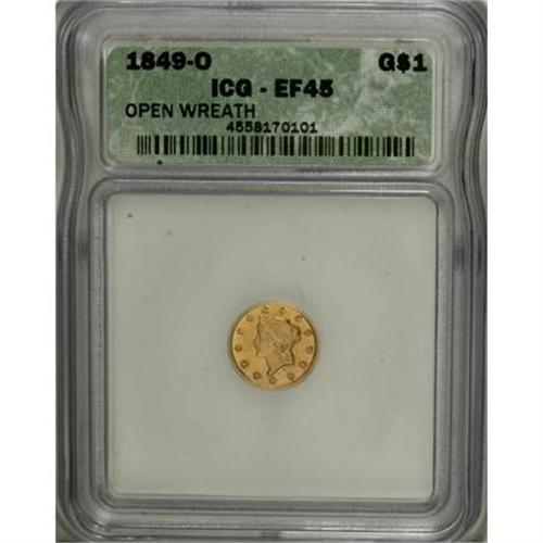 <B>1849-O G$1 Open Wreath XF45 ICG.</B></I> NGC Census: (20/502). PCGS Population (17/222). Mintage: 215,000. Numismedia Wsl. Price for NGC/PCGS coin in XF45: $245. (#7508)<BR><BR><B>Coin Engraver:</B> James B. Longacre<BR><BR><b>Shipping:</b> Coins & Currency (<a target="_blank" href="http://www.heritageauctions.com/common/shipping.php">view shipping information</a>)