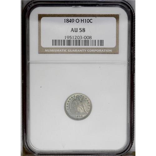 <B>1849-O<H10C> AU58 NGC.</B></I> The obverse is highly lustrous with vivid blue-green color across much of the surface, while the reverse is light grayish-brown with a few splashes of iridescence. A vertical ridge extends from the border to the base of Liberty, between the 1 and 8 in the date. <BR><BR><B>Important notice:</B> Heritage usually auctions material at the rate of 200-250 lots per hour. On some occasions eBay Live bid software or the Internet may not be able to keep up with the pace of the auction. We recommend placing a realistic absentee bid now as insurance to avoid disappointment. Occasionally the auctioneer may eliminate or reject an eBay Live bid, and the auctioneer may also reopen a lot after the close of the eBay live bidding (usually because we missed an audience bid), and may reject your bid even if it shows you as the winning bidder. By bidding via eBay Live, you agree that Heritage may award the lot to another bidder at its sole discretion under the circumstances described above or any other reasonable circumstances. Since eBay bids are not shown to us until we open the lot on the floor, we treat those bids just like floor bids. In most cases the floor responds before the eBay bid is presented to us, due to Internet lag time, so for consistency we have made it a policy that floor bids are always considered first over tie eBay live bids. Also please note that all Heritage lots purchased through eBay Live carry a 20% Buyer's Premium. Please make sure you read the Terms and Conditions before you bid. This lot is being auctioned in conjunction with a live floor auction by Heritage Galleries & Auctioneers. All final auction and invoice information will be supplied by Heritage Galleries & Auctioneers, and all other information should be considered preliminary. Lot:1887 <BR><BR><B>Winning Notification and Billing:</B> After the FINAL session in this auction is complete, Heritage will send e-mail and snail mail invoices. This process normally takes several days. All final auction and invoice information will be supplied by Heritage Galleries & Auctioneers, and all other information should be considered preliminary. <BR><BR>This auction will be conducted on a live auction floor and over the Internet through eBay Live. If you choose to place an absentee bid, please take a moment to <font color='#0000ff'><u><a href='http://pages.ebay.com/liveauctions/help/before/laabsentee.html'>learn how eBay Live absentee bidding works</a></u></font><font color='#000000'>