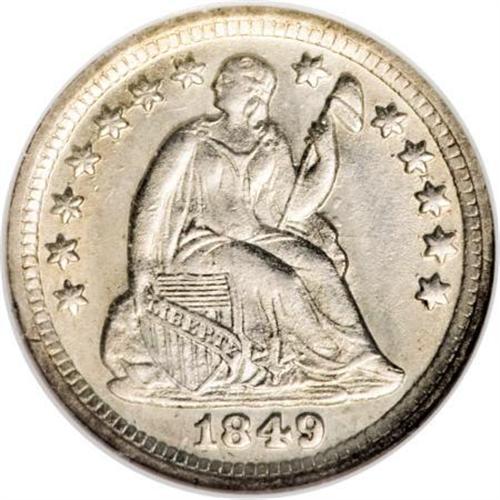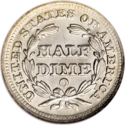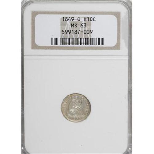 <B>1849-O H10C MS63 NGC.</B></I> V-1. Stars 1 through 7 are bold, with a connecting die crack, while stars 8 through 13 are mushy. Liberty's head, shield, and toe are sharp. The reverse shows die cracks through T in UNITED and M in AMERICA. This moderately lustrous, silvery specimen shows a light wash of gold over each side. Light die clashing is present on each side, and the obverse shows die rust. A pair of scratches appears in the center reverse, likely limiting an even finer grade. <BR><I>From The Al Blythe Collection of Half Dimes.</B></I><BR><BR><B>Coin Engraver:</B> Christian Gobrecht<BR><BR><b>Shipping:</b> Coins & Currency (<a target="_blank" href="http://www.heritageauctions.com/common/shipping.php">view shipping information</a>)