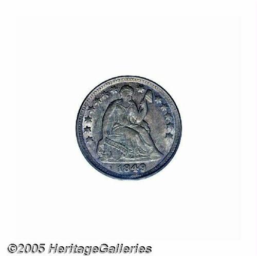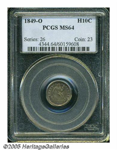<B>1849-O<H10C> MS64 PCGS.</B></I> This issue had a moderate mintage of 140,000 coins, with many of those lost or destroyed during the time of hoarding in the 1850s and 1860s. Today, few have survived in any grade, and very few in Mint State. Our own auction archives suggest that we have offered Mint State examples of this issue approximately once a year. This is a lovely example with deep olive and iridescent toning, and underlying frosty luster. It is tied for the finest certified by PCGS, and is seldom encountered even in this grade. Population: 9 in 64, 0 finer (5/05).