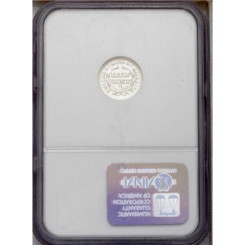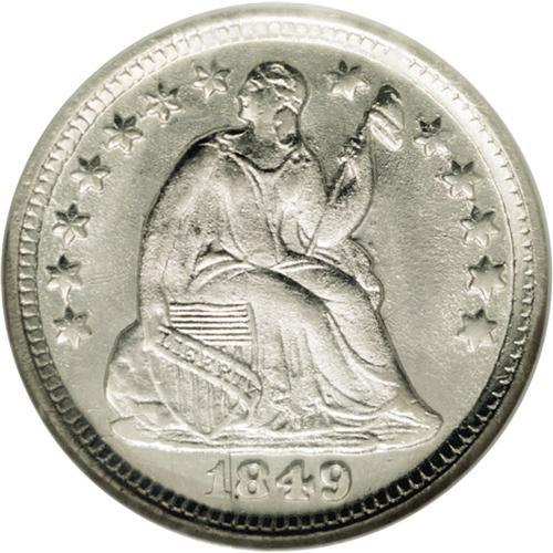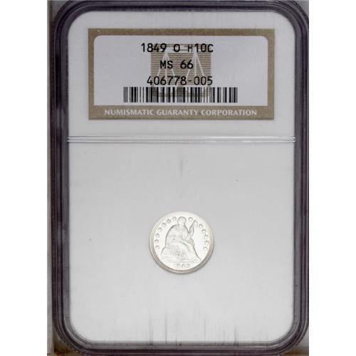<B>1849-O<H10C> MS66 NGC.</B></I> The 1849-O is a very elusive issue in all grades with only 140,000 pieces produced. Breen, who simply called this issue "rare," suggested that some of this already low mintage may have actually been dated 1848. Half Dime specialist Al Blythe went further by stating, "...specimens in higher grades (AU and above) are very scarce. Usually found in lower grades." In Mint State he rates the '49-O as a low R.6. This extraordinary '49-O has bright, satiny, untoned surfaces, and while it may not be fully struck in all areas, the silky-smooth surfaces more than make up for lack of complete highpoint detail. Census: 3 in 66, 0 finer (1/06).