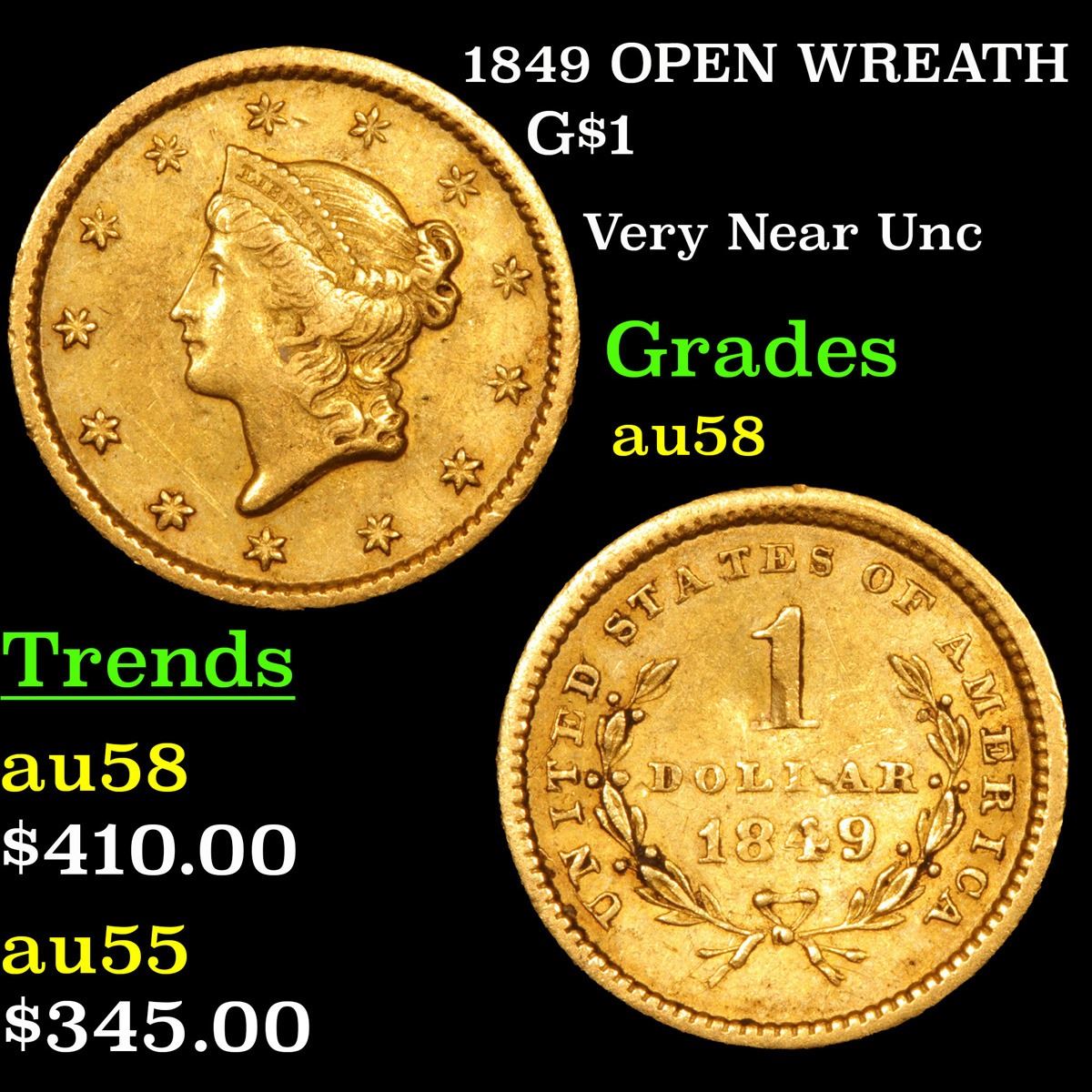 1849 OPEN WREATH Gold Dollar $1 Grades Choice AU/BU Slider.