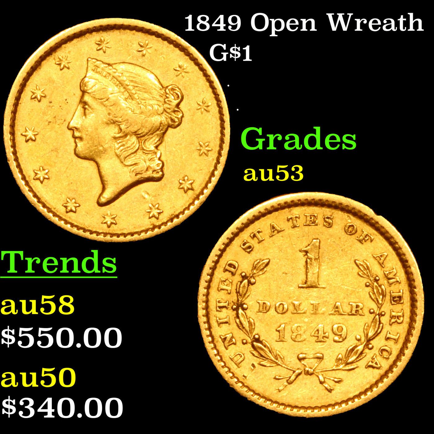1849 Open Wreath Gold Dollar $1 Grades Select AU.