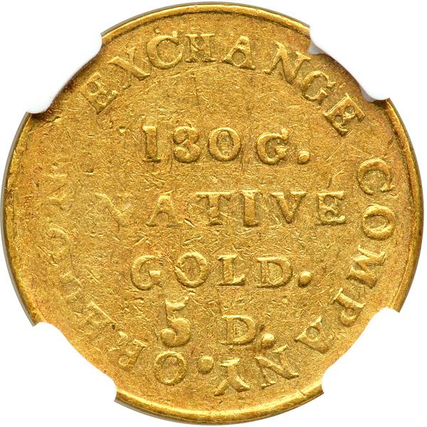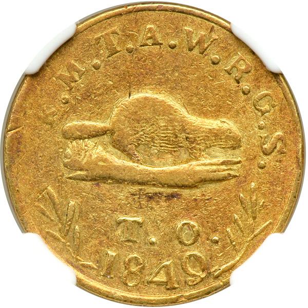 1849 Oregon Exchange Co. (Oregon) $5 Gold "Beaver". NGC graded AU-55. A decent strike for this great rarity with faded rose color overtones. During the generations before the California Gold Rush, the inhabitants of the Willamette Valley, Oregon, like those of the entire Pacific Northwest, managed to survive on a barter economy. The primary media of exchange, in addition to a meager supply of foreign silver and gold coins, were beaver pelts and wheat; the latter became legal tender by act of the Provisional Government of 1843. By the spring of 1848, the area's population had grown to 13,000, its largest settlement being Oregon City, population 800. On Aug. 9, 1848, gold dust from California arrived aboard the brig Henry, and within two months an estimated two-thirds of the Territory's male population had left for the California mining district, where they founded Hangtown (later called Placerville). By mid-January 1849, some $400,000 in gold dust reached Oregon, with the usual results: perpetual disputes over its weight and fineness, the necessity of weighing and testing, and petitions by the residents for a local mint. The Oregon Exchange Company stepped up to the plate as the first private mint producer in the region; the mint's output comprised 6,000 $5 pieces, along with 2,850 of the $10 gold.