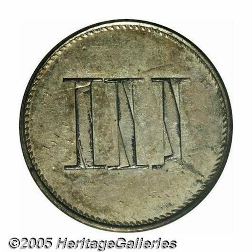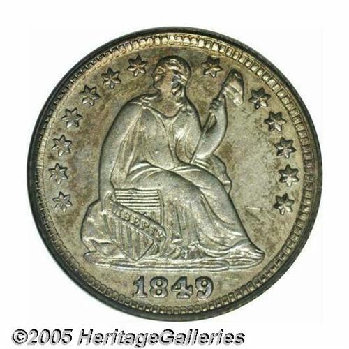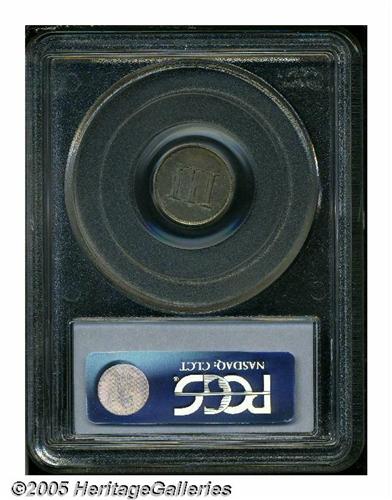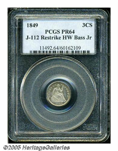 <B>1849<P3CS> Three Cent Silver, Judd-112 Restrike, Pollock-126, Low R.7, PR64 PCGS.</B></I> Ex: HW Bass Jr. The standard 1849 Seated Half Dime obverse, but paired with a somewhat crude and plain reverse die that bears the large Roman numeral III and has unusual slanted dentils. Struck with a reeded edge in an alloy of 60% silver, 40% copper. The regular issue 1851 Three Cent Silver, in comparison, has a smaller diameter and a less base alloy of 75% silver, 25% copper. The date is repunched, most apparent on the 1 and 9, the reverse is double struck with a rotation of 5 to 10 degrees between the two strikes. The second strike is rotated relative to the obverse. A crisp and unblemished example with original lilac and olive colors.<BR><I>Ex: Harry W. Bass, Jr. Collection, Part I (Bowers and Merena, 5/99), lot 1026, which realized $2,530; earlier purchased by Bass from Lee Hewitt on April 17, 1972.</B></I><BR><I>From The Western Hills Collection.</B></I>