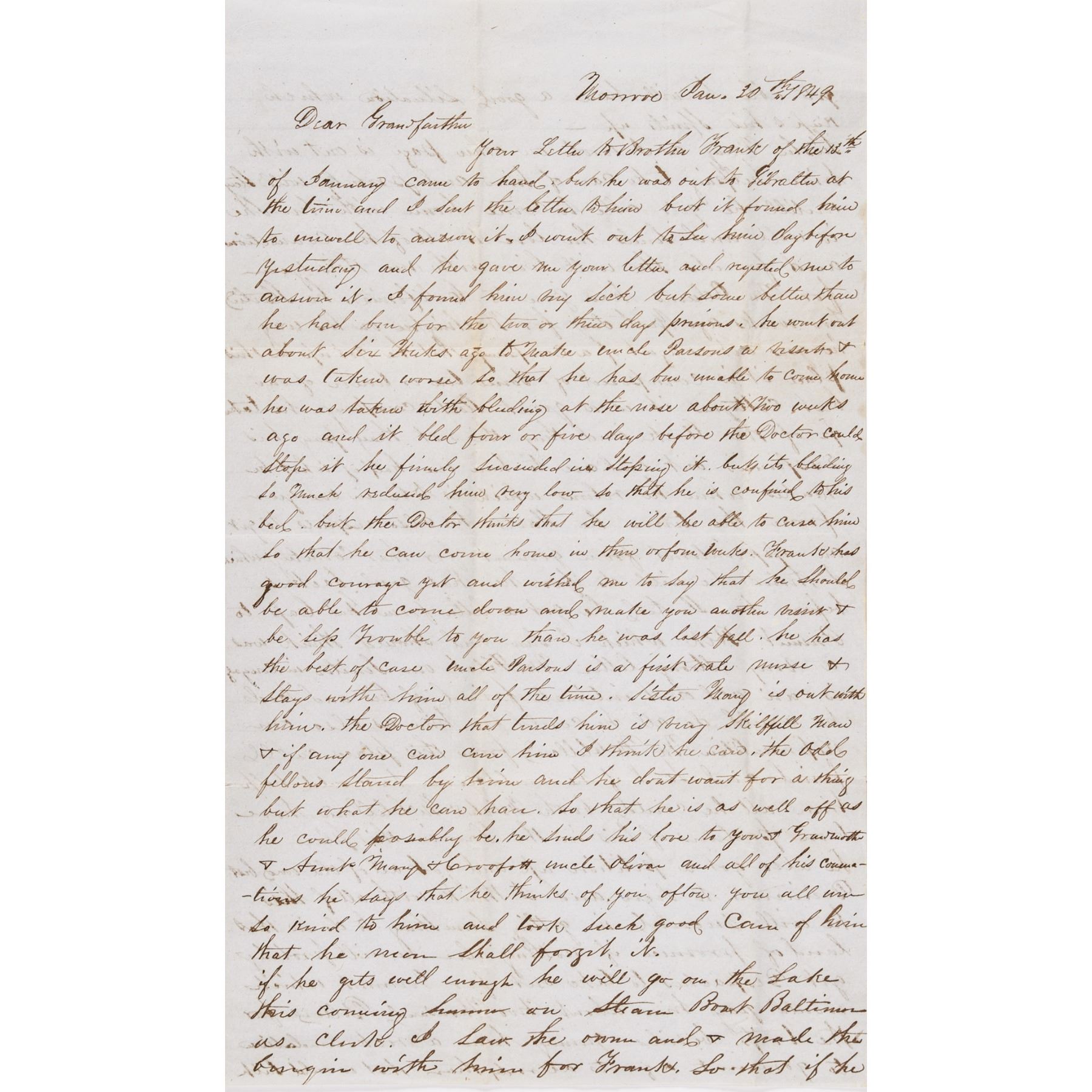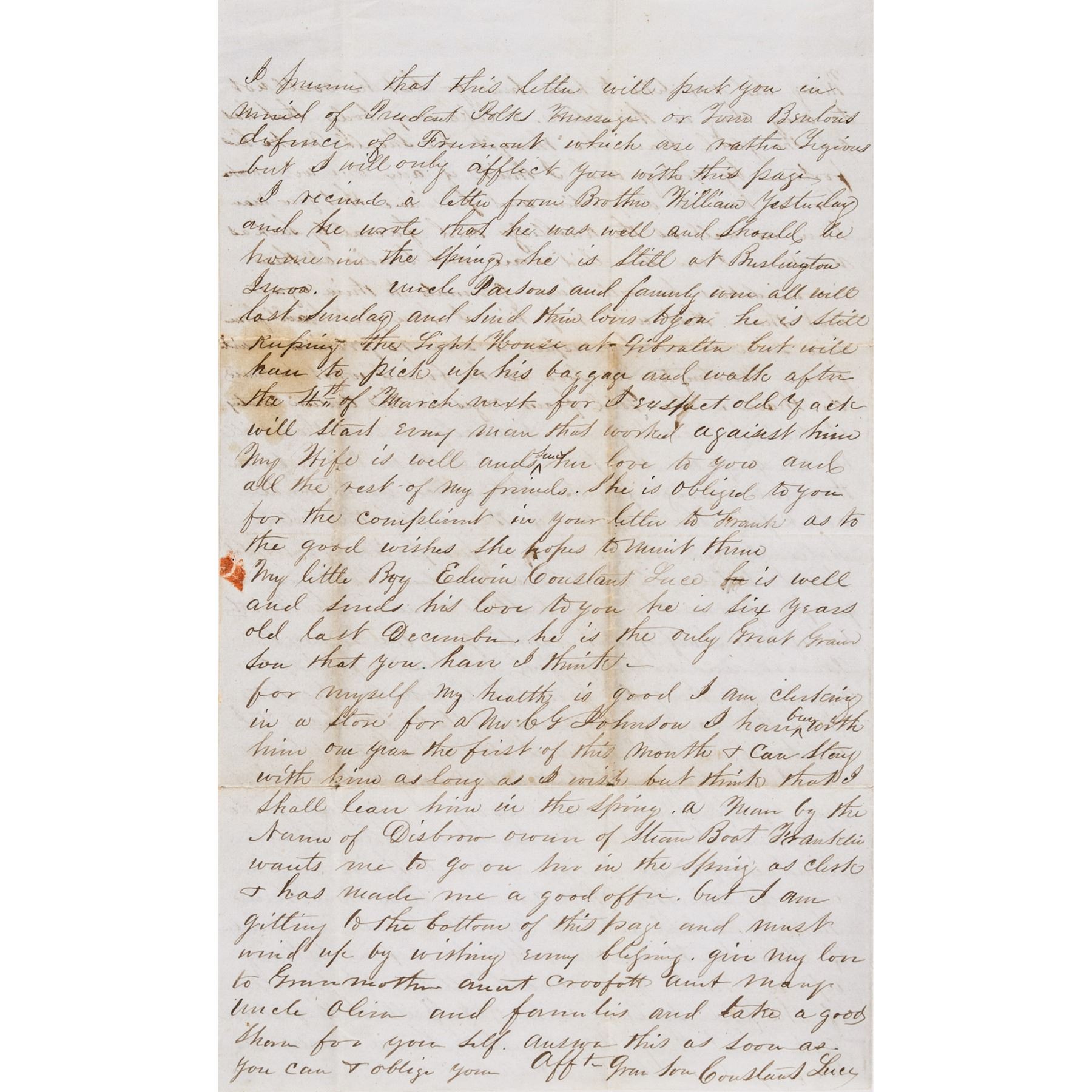 An Original early 1849 “Gold Rush” period Autograph Letter Signed, “Constant Luce”, 4 pages, measuring 7.5” x 12.25” (open), Monroe (Michigan), transmittal folds. Written to his Grandfather, he discusses his brother-in-law's journey to California during the Gold Rush, the “Wilmot Proviso,” and covers many topics of the time in addition to family news. He writes in part, his sister Mary: