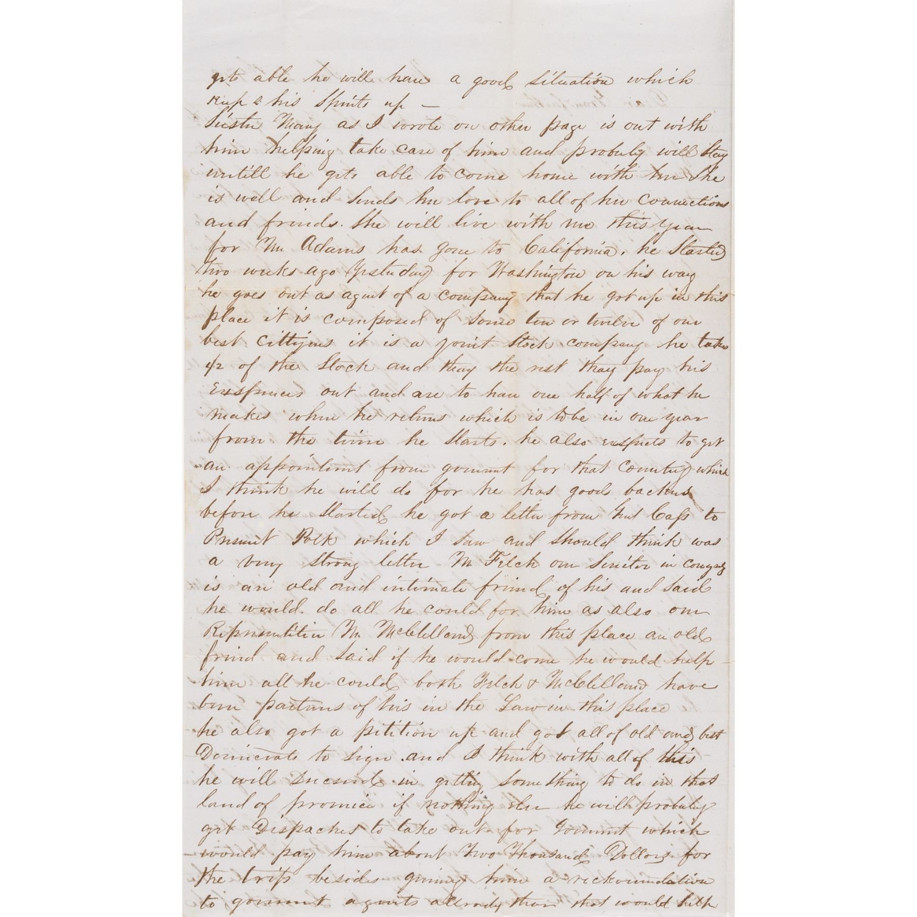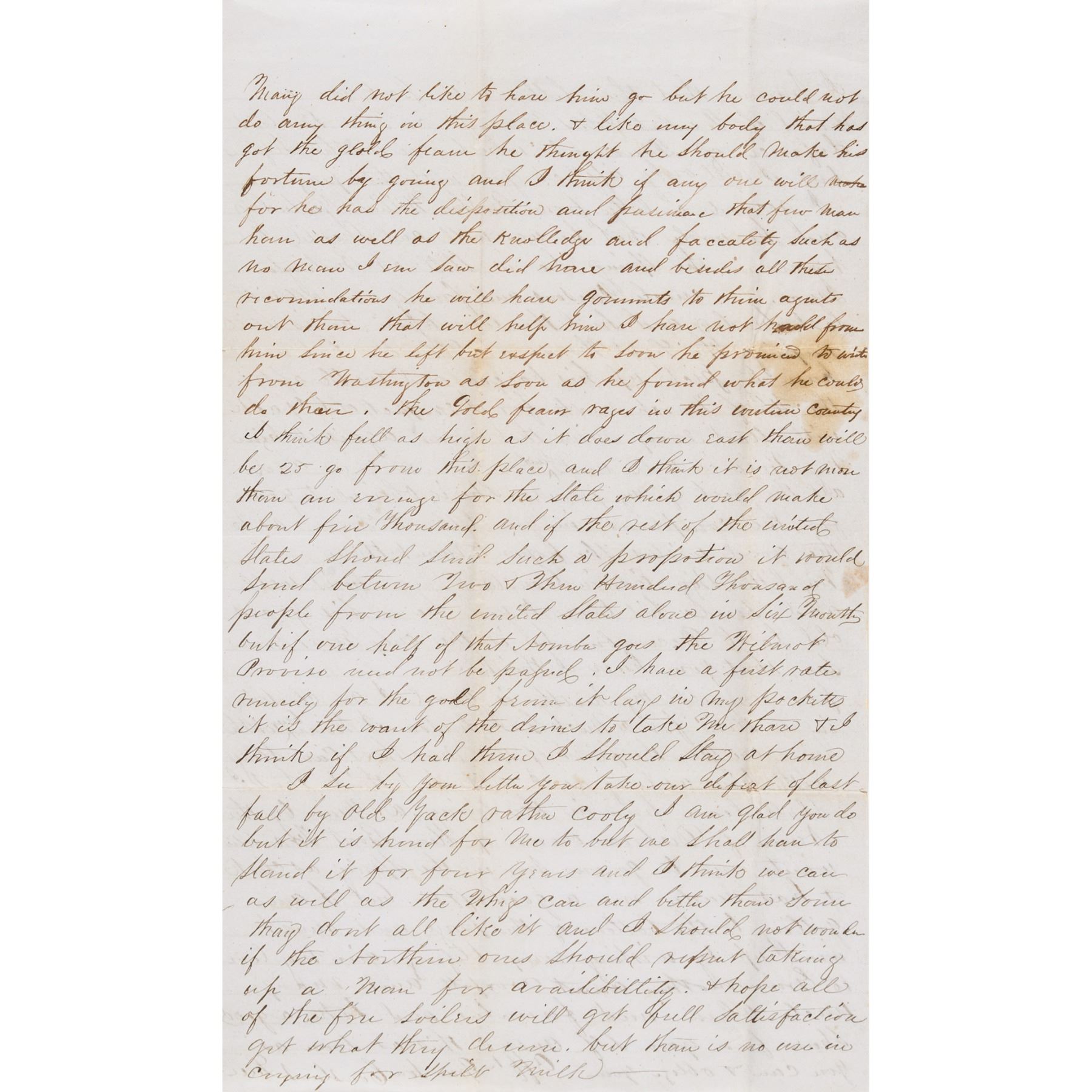 "will live with me this year for Mr. Adams has gone to California. He started two weeks ago yesterday for Washington on his way he goes out as agent of a company that he got up in this place... before he started he got a letter from Genl Cass to President Polk which I saw and should think was a very strong letter. Mr. Felch our Senator in Congress is an old and intimate friend of his... I think with all of this he will succeed in getting something to do in that land of promise... The Gold fever rages in this western country... I think it is not more than an average for the State which would make about five thousand and if the rest of the United States should send such a proportion it would send between two three hundred thousand people from the United States alone in six months but if one half of that number goes the Wilmot Proviso need not be passed... I see by your letter you take our defeat of last fall by Old Zach (Zachary Taylor) rather cooly... I am glad you do but it is hard for me to but we shall have to stand it for four years and I think we can as well as the Whigs can and better than some they don't all like it... hope all of the free Soilers will get full satisfaction get what they deserve, but there is no use in crying for spilt milk... I presume that this letter will put you in mind of President Polks message or Tom Bentons defense of Fremont..." much more.