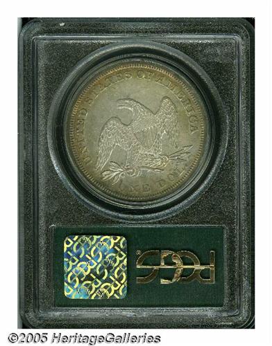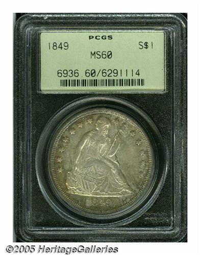 <B>1849<S$1> MS60 PCGS.</B></I> Rich golden-brown and russet colors adorn the peripheries, on each side of this typically struck example. Lustrous and minimally marked, for the assigned grade level. With a mintage of 62,600 pieces, the 1849 is quite elusive in Mint State.<BR><I>From The Dr. John L. Pellegrini Collection of Liberty Seated Dollars.</B></I>