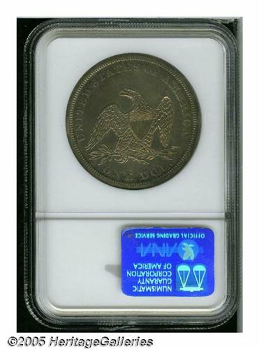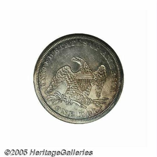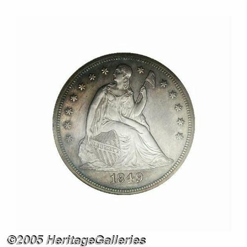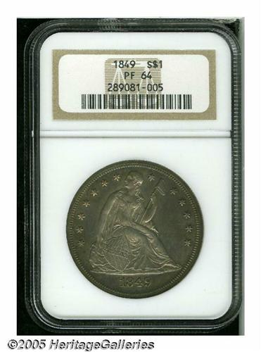 <B>1849<S$1> PR64 NGC.</B></I> The proof 1849 Seated dollar is generally considered the rarest proof from the 1840s, and is even scarcer than the well-known 1841 and 1843. Since 1992 only 10 coins have appeared in major public auctions, and five of those pieces have been in a Heritage sale. No explanation has been posited for the absolute scarcity of this issue, but it is known that proof coins, in general, hit a low point in production from 1849 through 1853. No proof sets of this date are known, and according to Walter Breen, there is no record of any having been made. Only 8-12 proof dollars are believed to have been struck, and of that number some 5-8 separate examples are believed known today. The population data from the two major services is somewhat misleading as 14 pieces show to have been certified. Of course, a fairly high percentage of those 14 coins are resubmissions, as this issue is known to be much rarer than the stated combined populations.<BR> Proofs of this date show a peculiar and distinctive imperfection on the 4 in the date. One other diagnostic is the presence of die rust below and to the left of the 1 in the date, near the border. We do not see that on this particular coin; however, what we do see is what appears to be several spikes that protrude from the denticles that seem to be short marks from a graver. The reverse is a non-event, with the stock 1840-1850 proof reverse die used here as well as on earlier dates from this decade. The coin overall has a few light hairlines, as one would expect, with an overlay of irregular golden-brown and blue toning. The fields are deeply reflective, also as one would expect, with almost complete striking definition on the design elements.<BR><I>From The Dr. John L. Pellegrini Collection of Liberty Seated Dollars.</B></I>