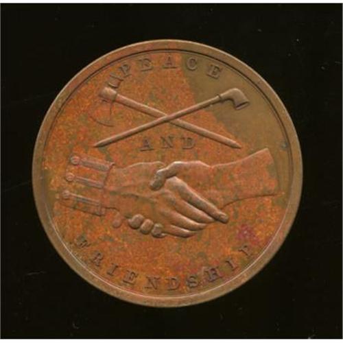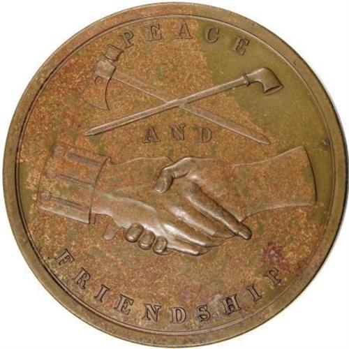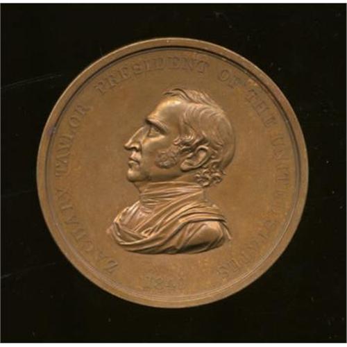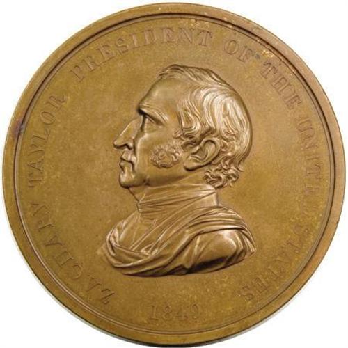 <B>1849 Zachary Taylor Indian Peace Medal, First Size, Second Reverse, Julian-IP-27, Uncirculated Uncertified.</B></I> Bronzed copper, 76 mm, rim 7.4 mm, 243.1 gm. Obverse engraved by Henry Kirke Brown, reverse by John Reich. Bust left, rev. clasped hands, pipe and tomahawk, PEACE AND FRIENDSHIP, flat-topped A's and finger pointing above the R in FRIENDSHIP, as with all of the 1846-redesigned Second Reverse. A pleasing two-toned peace, lighter orange-brown on the obverse and a deep reddish-mahogany reverse. A few light contact marks are strewn about, none significant, and a crescent of olive-brown on the reverse is the apparent result of an old cleaning that was fortunately abandoned. Nonetheless a pleasing piece, with much luster remaining on the prooflike obverse.<BR><BR><b>Shipping:</b> Coins & Currency (<a target="_blank" href="http://www.heritageauctions.com/common/shipping.php">view shipping information</a>)