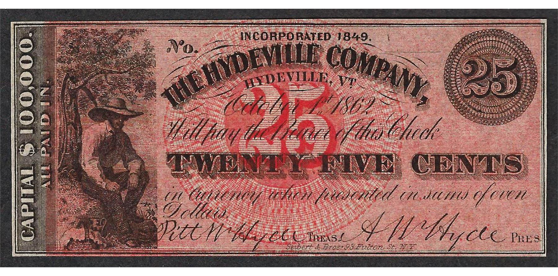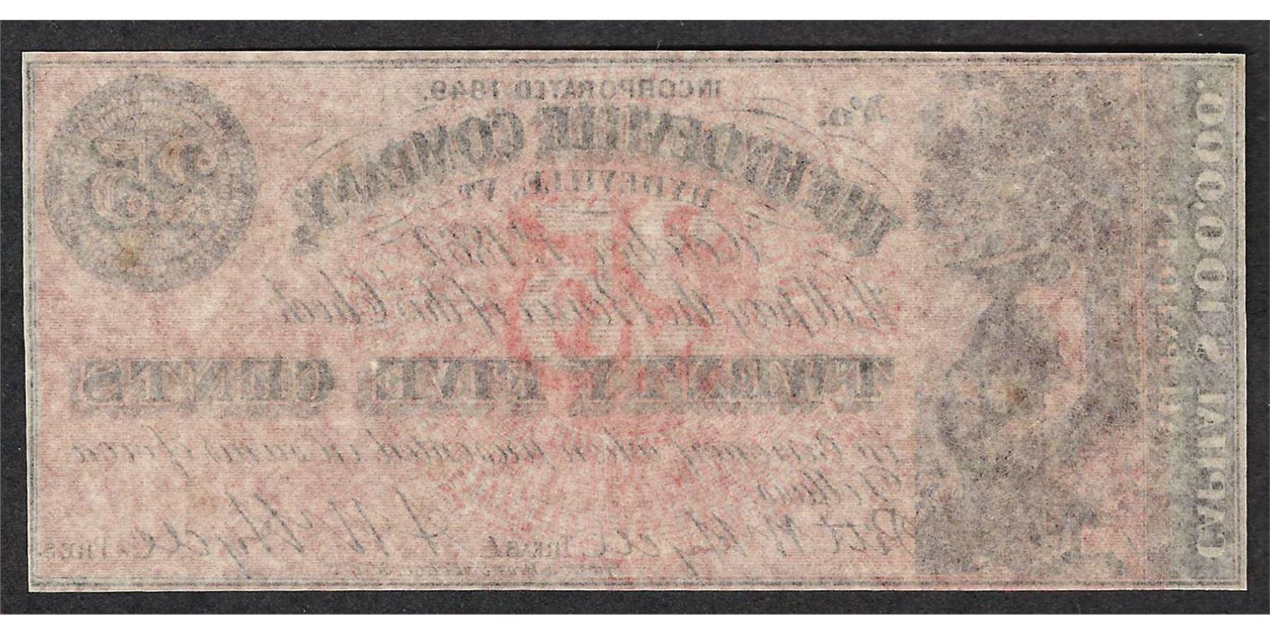 One 1849 Twenty Five Cents The Hydeville Company Obsolete Note.