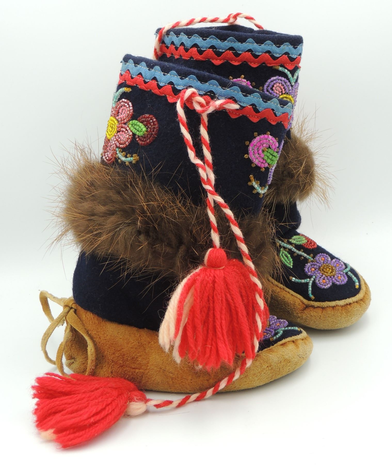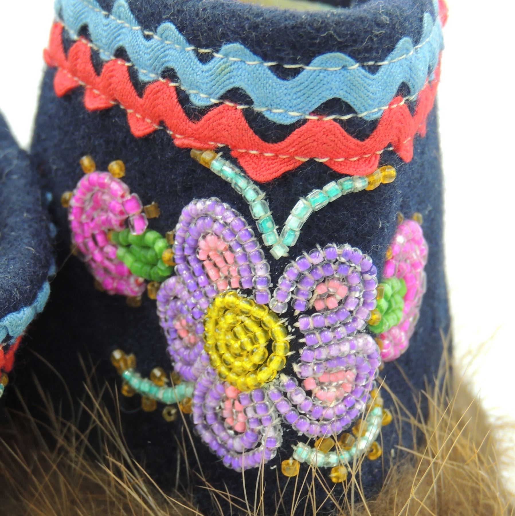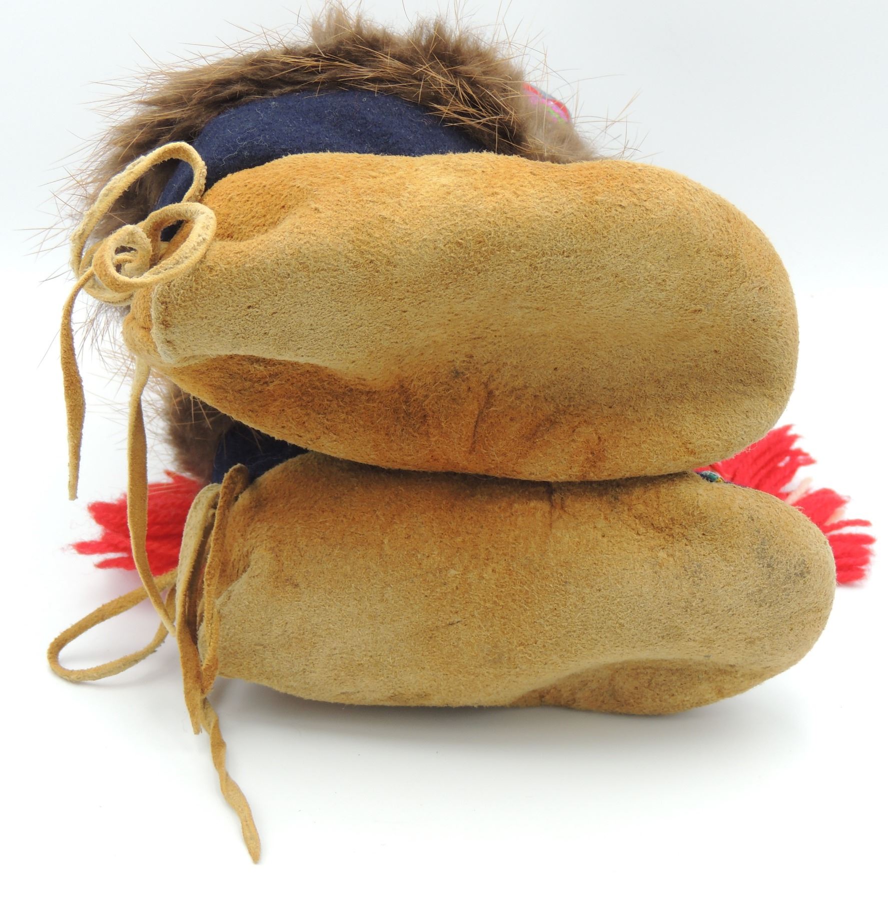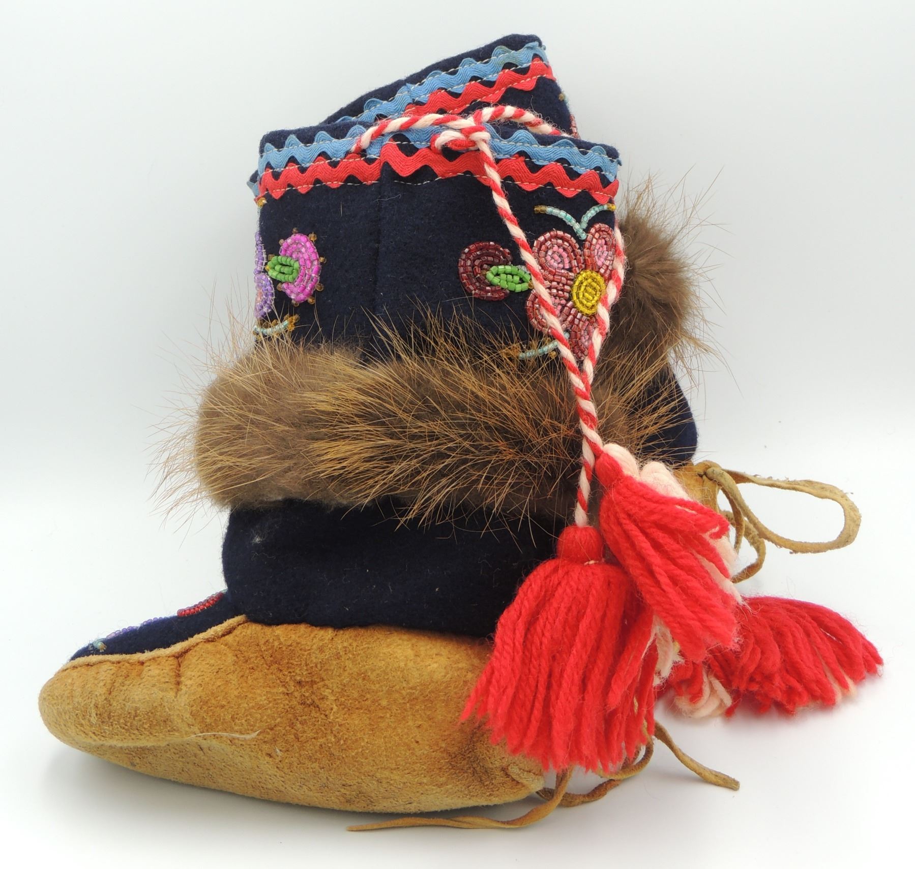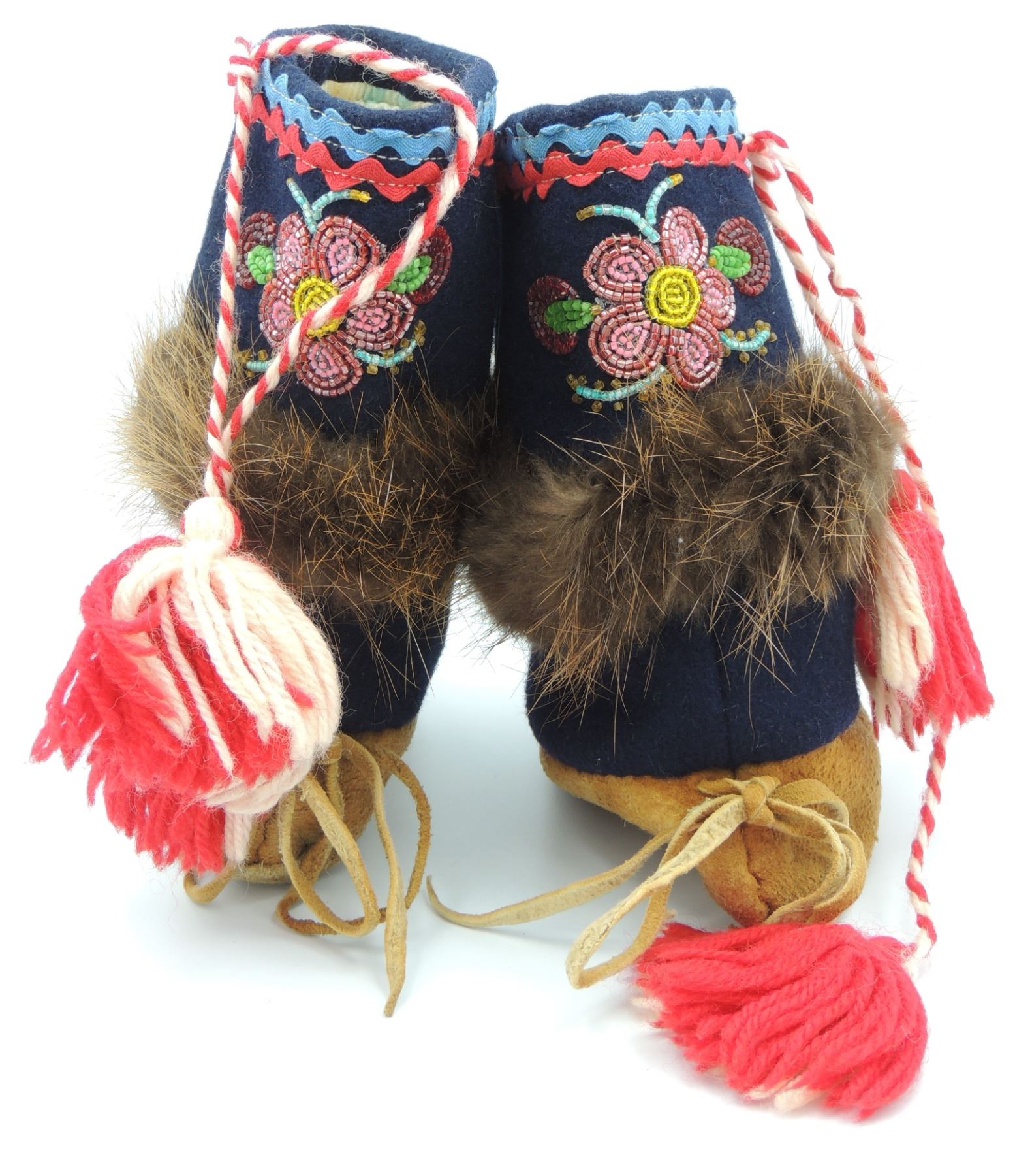 Childrens Boots Measure 5.5 Inches Long, 3 Inches Wide and 7 Inches Tall. Constructed of buckskin / deerskin on sole, with intricate floral design beadwork on lower and upper sections - with additional red/blue stripes. Center has fur strip, and both boots have red/white tassels. Please see our Other Auctions for additional - First Nations -Aboriginal -Indigenous Peoples - Métis- Metis - Iniut - Native American - Plains Indian - Artefacts