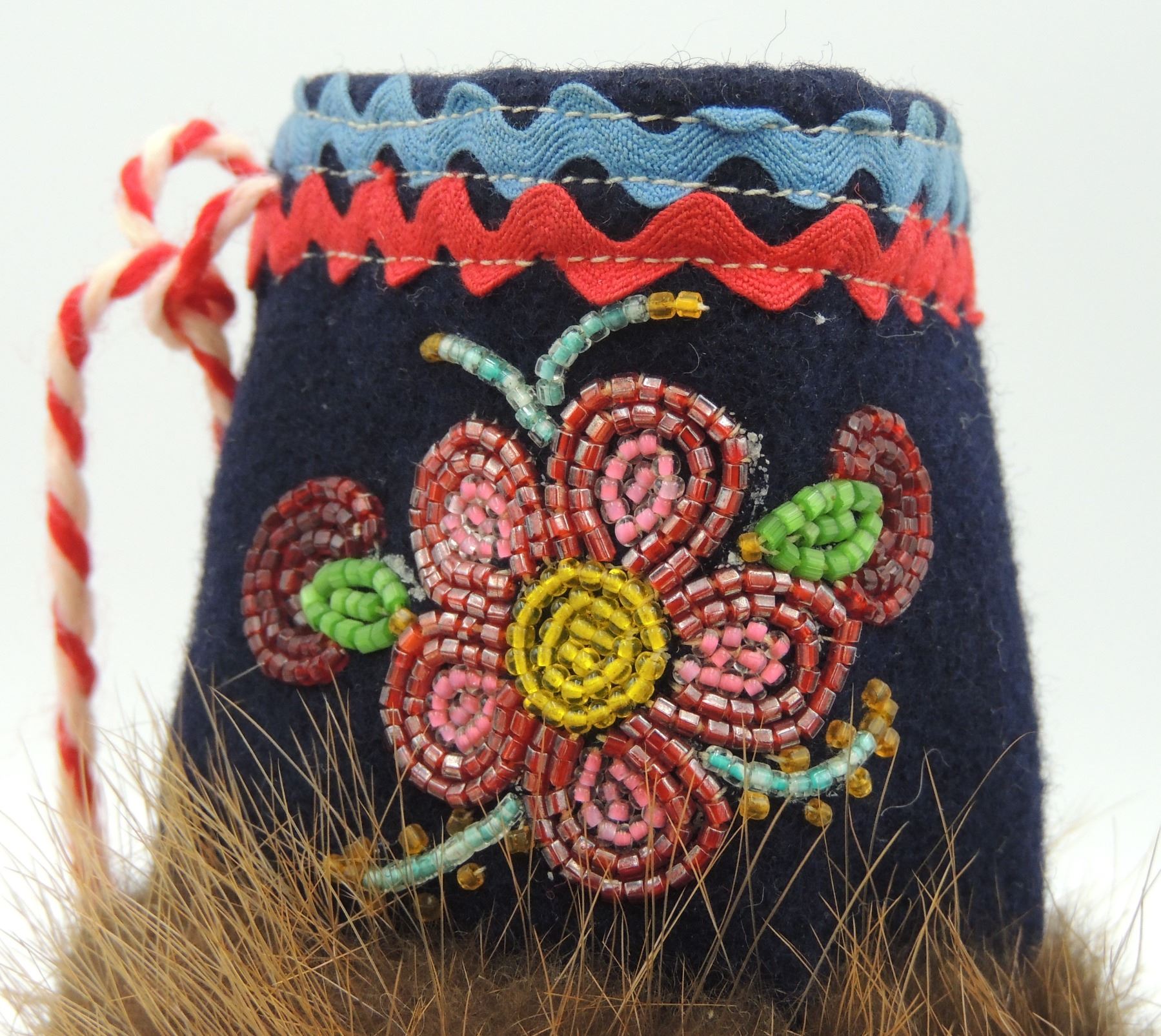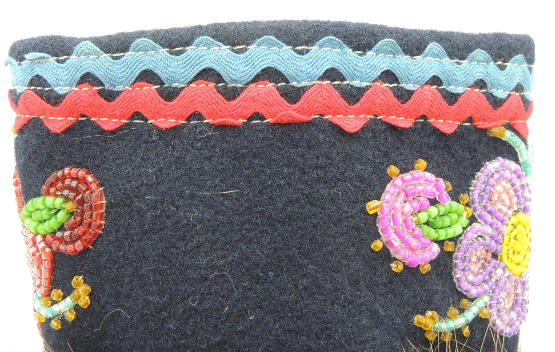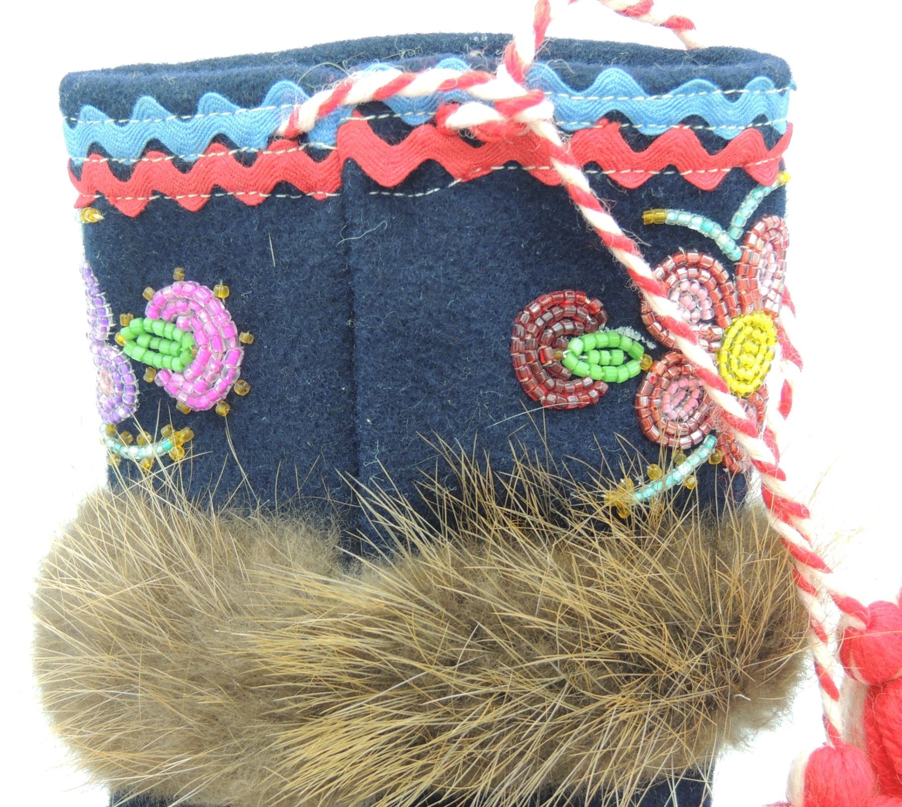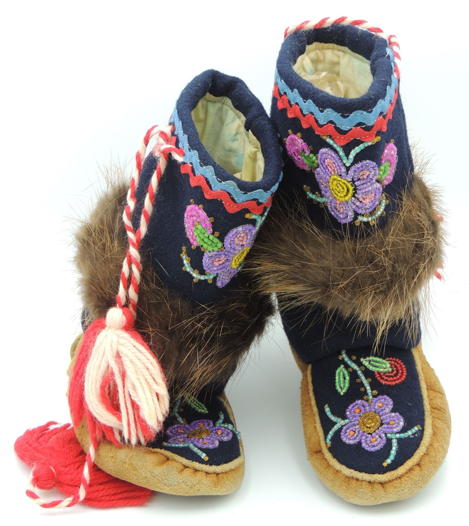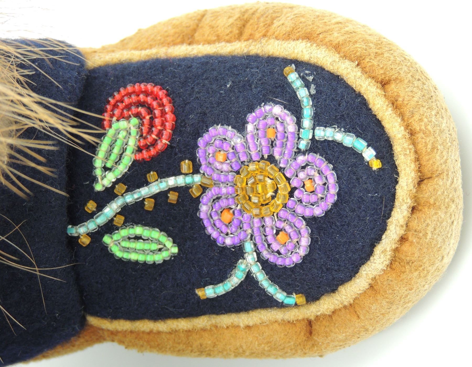 Childrens Boots Measure 5.5 Inches Long, 3 Inches Wide and 7 Inches Tall. Constructed of buckskin / deerskin on sole, with intricate floral design beadwork on lower and upper sections - with additional red/blue stripes. Center has fur strip, and both boots have red/white tassels. Please see our Other Auctions for additional - First Nations -Aboriginal -Indigenous Peoples - Métis- Metis - Iniut - Native American - Plains Indian - Artefacts