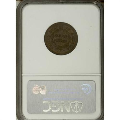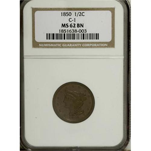 <B>1850 1/2 C MS62 Brown NGC.</B></I> C-1. NGC Census: (38/37). PCGS Population (14/48). Mintage: 39,800. Numismedia Wsl. Price for NGC/PCGS coin in MS62: $408. (#1221)<BR><BR><B>Coin Engraver:</B> Christian Gobrecht<BR><BR><b>Shipping:</b> Coins & Currency (<a target="_blank" href="http://www.heritageauctions.com/common/shipping.php">view shipping information</a>\)