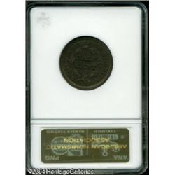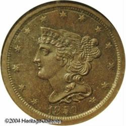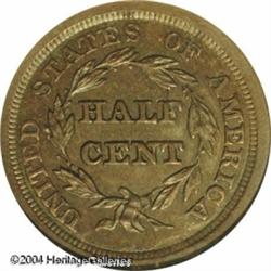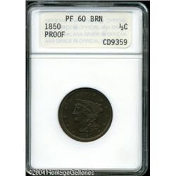 1850 1/2 C PR60 Brown ANACS. B-1, C-1, the only kn <B>1850 1/2 C PR60 Brown ANACS.</B></I> B-1, C-1, the only known dies, Low R.7. The modest reflectivity in the fields is only evident at certain angles. The central features are, however, boldly defined and the glossy-brown surfaces are free of mentionable distractions. One of perhaps twelve extant 1850 proof Half Cents. <BR><BR><B>Important notice:</B> Heritage usually auctions material at the rate of 200-250 lots per hour. On some occasions eBay Live bid software or the Internet may not be able to keep up with the pace of the auction. We recommend placing a realistic absentee bid now as insurance to avoid disappointment. Occasionally the auctioneer may eliminate or reject an eBay Live bid, and the auctioneer may also reopen a lot after the close of the eBay live bidding (usually because we missed an audience bid), and may reject your bid even if it shows you as the winning bidder. By bidding via eBay Live, you agree that Heritage may award the lot to another bidder at its sole discretion under the circumstances described above or any other reasonable circumstances. Since eBay bids are not shown to us until we open the lot on the floor, we treat those bids just like floor bids. In most cases the floor responds before the eBay bid is presented to us, due to Internet lag time, so for consistency we have made it a policy that floor bids are always considered first over tie eBay live bids. Also please note that all Heritage lots purchased through eBay Live carry a 20% Buyer's Premium. Please make sure you read the Terms and Conditions before you bid. This lot is being auctioned in conjunction with a live floor auction by Heritage Galleries & Auctioneers. All final auction and invoice information will be supplied by Heritage Galleries & Auctioneers, and all other information should be considered preliminary. Lot:5023