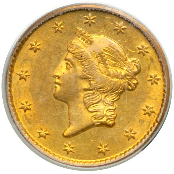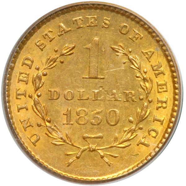1850. PCGS graded AU-58. Pleasing deep orange toning (PCGS # 7509) .
