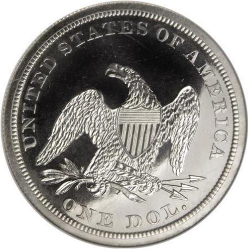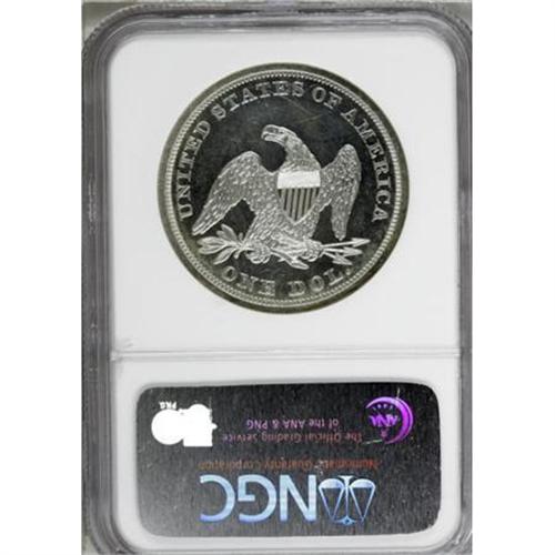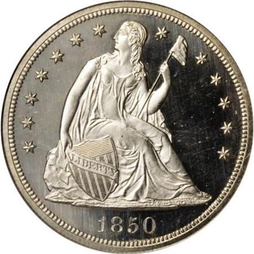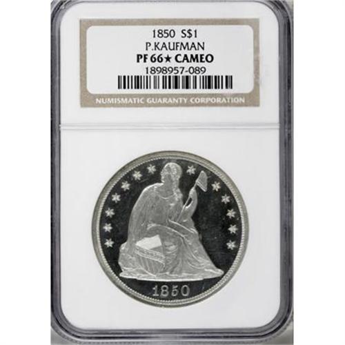 <B>1850 $1 PR66 </B></I><img src="/images/star.gif" width="10" height="10" alt="" border="0"><B> Cameo NGC.</B></I> Ex: P. Kaufman. Although the surviving population of proof 1850 silver dollars is higher than earlier years, it is an extremely rare issue with cameo contrast. Phil Kaufman's proof 1850 dollar is the finest of about 20 proofs known, the only Premium Gem that carries NGC's Star Designation. It is also identified as a Cameo proof, one of just three pieces so designated.<BR><BR>The Kaufman coin is the variety with the open 5 in the date, which also has the base of the 0 double punched, and die file marks at the rim below 50. Bowers indicates that other Open 5 specimens include the Garrett Collection coin (now in the American Numismatic Society Collection) and the Floyd T. Starr Collection piece. A later die state of the Open 5 variety displays a heavy crack through the base of the date.<BR><BR> Bowers recognizes a second variety of the 1850 proof dollar-the closed 5 that lacks repunching at the base of 0 in 1850. The reverse exhibits die file marks filling most of the shield interstices. Two arrows are joined, and faint die cracks are usually seen through ON of ONE and TED of UNITED. Bowers notes that the Byron Reed 1850 proof dollar is of this variety.<BR><BR>Following is a roster of 1850 proof dollars based on a comprehensive review of available plated auction catalogs:<BR><BR><B>1. PR66 * Cameo. The Kaufman coin</B></I>, which does not appear to match any of the specimens listed below.<BR><BR><B>2. PR66 NGC.</B></I> T.J. Schaeffer, Noble, PA; Floyd T. Starr (Stack's, 10/1992), lot 593; Morris Silverman Collection (Heritage, 4/2002), lot 4077; Rod Sweet Collection (Bowers and Merena, 7/2005), lot 1011; Jack Lee; Heritage (11/2005), lot 2238; Heritage (2/2006), lot 23395.<BR><BR><B>3. PR66 NGC.</B></I> American Numismatic Rarities (8/2004), lot 583; American Numismatic Rarities (1/2005), lot 681.<BR><BR><B>4. PR64 Cameo NGC.</B></I> Richmond Collection (David Lawrence, 11/2004), lot 1515.<BR><BR><B>5. PR64 PCGS.</B></I> Amon Carter Collection (Stack's, 1/1984), lot 258; Heritage (5/1990), lot 972; Heritage (10/1995), lot 6061.<BR><BR><B>6. PR64 PCGS.</B></I> George H. Earle, Jr. (Henry Chapman, 6/1912); J.M. Clapp; Clapp Estate; Louis E. Eliasberg, Sr.; Eliasberg Estate (Bowers and Merena, 4/1997), lot 2217; Goldberg Coins (2/2003), lot 716.<BR><BR><B>7. PR64 PCGS.</B></I> Stack's (3/1995), lot 186; Superior (10/2000), lot 4391; Dr. John L. Pellegrini Collection (Heritage, 7/2005), lot 10265.<BR><BR><B>8. PR64 NGC.</B></I> Bowers and Merena (6/1990), lot 701; Bowers and Merena (5/1995), lot 1220.<BR><BR><B>9. PR64 NGC.</B></I> Superior (6/1987), lot 1958; Superior (9/1993), lot 1311; Bowers and Merena (5/1995), lot 1221; NGC Heritage (9/1996), lot 6348.<BR><BR><B>10. PR64.</B></I> Bowers (10/1977), lot 1063; Heritage (8/1998), lot 8196; Bowers and Merena (11/2002), lot 4058; Goldberg Coins (2/2003), lot 717.<BR><BR><B>11. Proof.</B></I> New Netherlands Coin Co. (privately, 7/1944); John Jay Pittman (David Akers, 5/1998), lot 1681.<BR><BR><B>12. PR63 NGC.</B></I> Stack's (9/1974), lot 42; Bowers and Merena (7/2005), lot 701.<BR><BR><B>13. PR63 NGC.</B></I> Superior (10/1989), lot 3825; Heritage (8/1995), lot 6553<BR><BR><B>14. PR63. </B></I>Norweb Collection (Bowers and Merena, 11/1988), lot 3793.<BR><BR><B>15. PR63.</B></I> Bowers (12/1977), lot 5845; L.R. French, Jr. Family Collection (Stack's, 1/1989), lot 30.<BR><BR><B>16. PR62 PCGS.</B></I> Goldberg Coins (5/2001), lot 866; Heritage (7/2003), lot 8284.<BR><BR><B>17. Proof.</B></I> Randall Collection (W. Elliot Woodward, 9/1885), lot 75; Garrett Collection (Stack's, 3/1976), lot 267.<BR><BR><B>18. Proof.</B></I> Stack's (10/1995), lot 701; Stack's (3/1996), lot 512 <BR><BR><B>19. Proof.</B></I> Kreisberg (11/1976), lot 1122.<BR><BR><B>20. Proof.</B></I> Stack's (12/1974), lot 831<BR><BR><B>21. PR60 ANACS.</B></I> Heritage (6/1995), lot 5671; Heritage (1/1996), lot 5639; Heritage (3/1996), lot 6491; Heritage (9/1996), lot 6347.<BR><BR><B>22. Proof, polished.</B></I> Bowers (2/1979), lot 832.<BR><BR><B><I>Additional Appearances</B></I></B></I><B>:<BR><BR>A. Proof.</B></I> Stack's (5/1992), lot 2710. Not plated.<BR><BR><B>B. Proof.</B></I> Frederick Geiss (B. Max Mehl, 2/1947), lot 345. Not plated, possibly to Carter.<BR><BR><B>C. Proof.</B></I> Byron Reed; Omaha City Library. Lot 378 in the Christies sale of items from The Bryon Reed Collection is an 1850 silver dollar described as deeply toned with prooflike surfaces. It is likely the coin that Breen mentioned in his <I>Proof</B></I> <I>Encyclopedia</B></I>.<BR><BR><B>D. </B></I>We are also aware of 10 or so other 1850 proof dollar appearances in catalogs that are not accessible to us, or are not plated.<BR><BR> Majestic untoned surfaces on this Premium Gem yield a stunning white-on-black appearance that jumps out at the observer. An attentive strike leaves full delineation at all points of the design elements, which further accentuates the incredible field-device contrast. Die polish lines traverse the fields, particularly on the obverse where they are heavy. A minute mark on Liberty's right (left facing) wrist and a minuscule spot on the thigh to the upper right of the shield may help in the identification of this coin for future catalogers. An incredibly captivating Cameo that is sure to capture the attention of proof Seated Liberty aficionados.<BR><I>From The Phil Kaufman Collection of Early Seated Proof Sets, Part Two.</B></I><BR><BR><b>Shipping:</b> Coins & Currency (<a target="_blank" href="http://www.heritageauctions.com/common/shipping.php">view shipping information</a>)