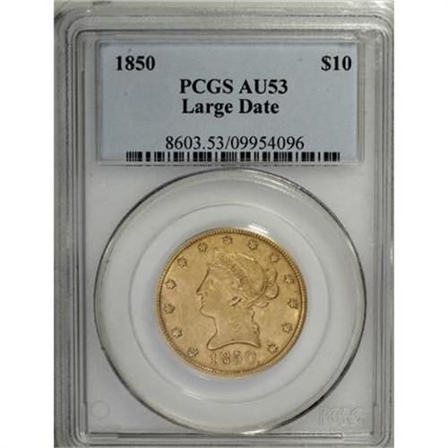 <B>1850 $10 Large Date AU53 PCGS.</B></I> . PCGS Population (14/29). NGC Census: (54/127). Mintage: 291,451. Numismedia Wsl. Price for NGC/PCGS coin in AU53: $600. (#8603)<BR><BR><B>Coin Engraver:</B> Christian Gobrecht<BR><BR><b>Shipping:</b> Coins & Currency (<a target="_blank" href="http://www.heritageauctions.com/common/shipping.php">view shipping information</a>)
