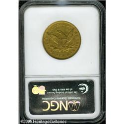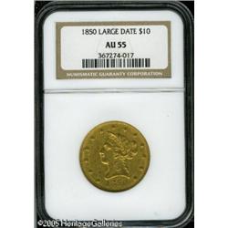 <B>1850 $10 Large Date AU55 NGC.</B></I> Even though this is the more common of the two varieties issued in 1850, the Large Date is very scarce in conditions of AU and finer. This piece exhibits moderate contact marks with some remaining luster. Lot:8741