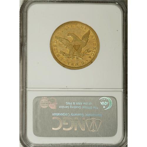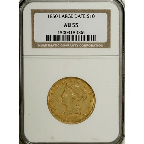 1850 $10 Large Date AU55 NGC. This piece has rich gree