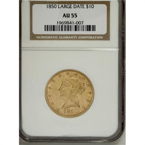 <B>1850 $10 Large Date AU55 NGC.</B></I> This smooth straw-gold Choice AU No Motto ten has its share of gently glowing luster. An attractive if slightly subdued example of this scarce gold type.<BR><BR><B>Coin Engraver:</B> Christian Gobrecht<BR><BR><b>Shipping:</b> Coins & Currency (<a target="_blank" href="http://www.heritageauctions.com/common/shipping.php">view shipping information</a>)