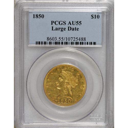 <B>1850 $10 Large Date AU55 PCGS.</B></I> While more common than its Small Date counterpart, this variety remains scarce as a Choice AU piece or better. Well struck with shining yellow-gold surfaces and numerous small handling marks from light circulation. Population: 13 in 55, 17 finer (2/07).<BR><BR><b>Shipping:</b> Coins & Currency (<a target="_blank" href="http://www.heritageauctions.com/common/shipping.php">view shipping information</a>)