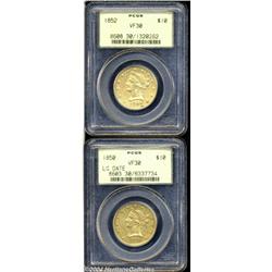 <table><tr><td><table><tr><td>1850 $10 Large Date VF30 PCGS, sharp for the grade, rose-tinged remaining luster; and an 1852 VF30 PCGS, nicely detailed, traces of luster, minor debris along the obverse border, rotated 30 degree clockwise which is unusual for the series. Both pieces are housed in older green label holders. 2 Coins <BR><BR><B>Important notice:</B> Heritage usually auctions material at the rate of 200-250 lots per hour. On some occasions eBay Live bid software or the Internet may not be able to keep up with the pace of the auction. We recommend placing a realistic absentee bid now as insurance to avoid disappointment. Occasionally the auctioneer may eliminate or reject an eBay Live bid, and the auctioneer may also reopen a lot after the close of the eBay live bidding (usually because we missed an audience bid), and may reject your bid even if it shows you as the winning bidder. By bidding via eBay Live, you agree that Heritage may award the lot to another bidder at its sole discretion under the circumstances described above or any other reasonable circumstances. Since eBay bids are not shown to us until we open the lot on the floor, we treat those bids just like floor bids. In most cases the floor responds before the eBay bid is presented to us, due to Internet lag time, so for consistency we have made it a policy that floor bids are always considered first over tie eBay live bids. Also please note that all Heritage lots purchased through eBay Live carry a 20% Buyer's Premium. Please make sure you read the Terms and Conditions before you bid. <BR><BR><B>IMPORTANT ANNOUNCEMENT ABOUT RESERVES:</B> Heritage now divulges all reserves on its web site 7 days before every auction. If you want to know whether the reserve on this lot has been met, and if not, what the reserve amount is, please visit this lot page on the HeritageCoin.com web site, or email: bid@HeritageGalleries.com </span></font></td></tr></table></td></tr></table>