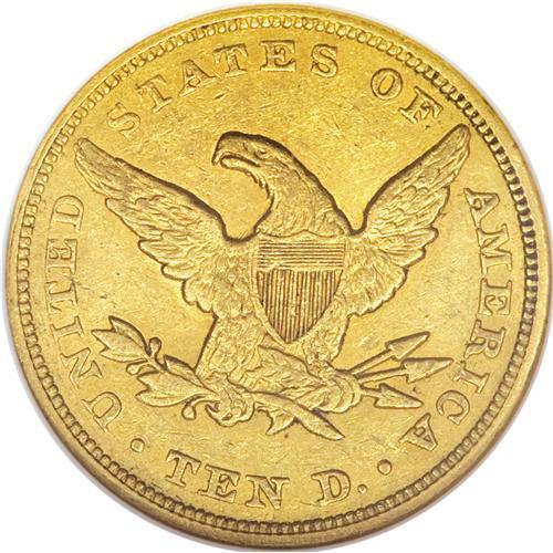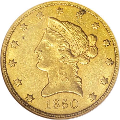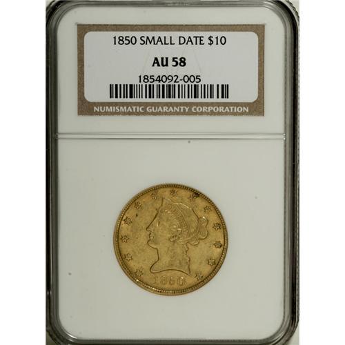 <B>1850 $10 Small Date AU58 NGC.</B></I> The Large Date variety is the most often seen of this date, and the Small Date variety is a major rarity in the series. It is also considerably underrated as a major collectible variety, perhaps because it was only recently added to the major listings in the <I>Guide Book.</B></I> This near-Mint example has lustrous green-gold surfaces with a trace of wear and scattered surface marks. Census: 16 in 58, 4 finer (4/07).<BR><BR><b>Shipping:</b> Coins & Currency (<a target="_blank" href="http://www.heritageauctions.com/common/shipping.php">view shipping information</a>)