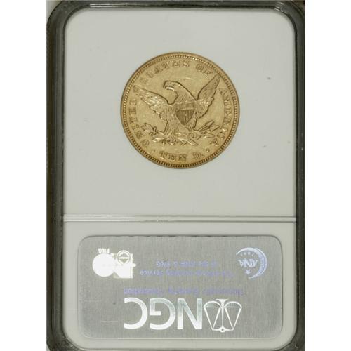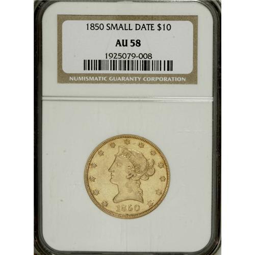 <B>1850 $10 Small Date AU58 NGC.</B></I> The Small Date is considerably scarcer than its Large Date cousin. They are best distinguished by the former having the 1 in the date about equidistant from the bust and the denticles, while the Large Date 1 is much closer to the bust than the dentils. Bright yellow-gold surfaces reveal ample luster, and are lightly abraded. The design elements are sharply defined, save for softness in the star centers.<BR><BR><b>Shipping:</b> Coins & Currency (<a target="_blank" href="http://www.heritageauctions.com/common/shipping.php">view shipping information</a>)