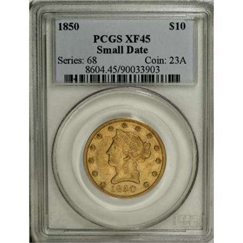 <B>1850 $10 Small Date XF45 PCGS.</B></I> An elusive logotype variety that constitutes a small minority of the mintage of 291,451 pieces. This bright and pleasingly detailed lemon-gold piece has ample luster and few abrasions overall. Population: 20 in 45, 41 finer (12/07).<BR><BR><B>Coin Engraver:</B> Christian Gobrecht<BR><BR><b>Shipping:</b> Coins & Currency (<a target="_blank" href="http://www.heritageauctions.com/common/shipping.php">view shipping information</a>)
