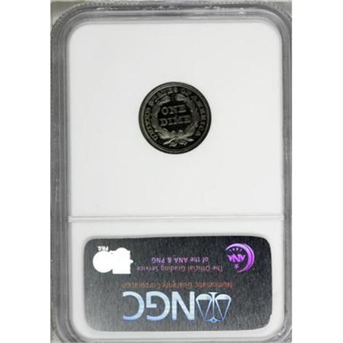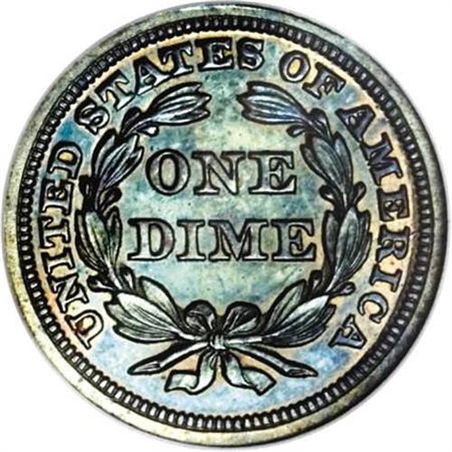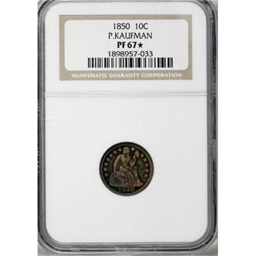 <B>1850 10C PR67 </B></I><img src="/images/star.gif" width="10" height="10" alt="" border="0"><B> NGC.</B></I> Ex: P. Kaufman. The Kaufman 1850 proof dime is the only known example graded PR67, and also the only proof that has received the special NGC Star designation. The mintage of the 1850 proof dime is unknown, but was undoubtedly very low. Our roster lists just six different examples, along with three other appearances that probably represent other auction appearances of the same coins.<BR><BR>In his October 1997 catalog of the Pittman Collection, David Akers says:<BR><BR>"... certainly no more than four or five (exist). Most of the recent great sales containing important Dime collections were lacking this date in Proof with the exception of the Floyd Starr collection sale in 1992, which contained a Choice Proof, and the Allen Lovejoy Collection in 1990, which contained a Proof that had formerly been in the Ellis Robison Collection. Norweb, Garrett, Eliasberg, Bareford, and James Stack, great collections with outstanding rarities and many Proofs, all failed to have an example of this date in Proof."<BR><BR> NGC and PCGS population data support the rarity of the 1850 proof. Both services have graded a total of just five pieces. The NGC-graded Superb Gem Kaufman piece is the finest certified, <I>and</B></I> possesses the coveted Star designation. NGC has also seen two PR63 examples, while PCGS reports a PR64 and a PR66 specimen.<BR><BR> The following roster of 1850 proof dimes is based on our comprehensive survey of auction records:<BR><BR><B>1. PR67 </B></I><img src="/images/star.gif" width="10" height="10" alt="" border="0"><B> NGC. The Kaufman coin,</B></I> which does not appear to match any of the following pieces.<BR><BR><B>2. PR67. </B></I> J.C. Morgenthau (1/1943), lot 367; Floyd Starr (Stack's, 10/1992), lot 367.<BR><BR><B>3. PR65. </B></I>French's (2/1959), lot 861; John Jay Pittman (David Akers, 10/1997), lot 605.<BR><BR><B>4. PR61. </B></I>Stack's (2/1974), lot 1254; Ellis Robison (Stack's, 2/1982), lot 1058; Allen Lovejoy (Stack's, 10/1990), lot 253.<BR><BR><B>5. Proof.</B></I> Essex Institute (Stack's, 2/1975), lot 493; Stack's (12/1982), lot 304; Stack's (10/1997), lot 463.<BR><BR><B><I>Additional Appearances</B></I></B></I><BR><BR><B>A. PR66 PCGS. </B></I>Virgil Brand; New Netherlands Coin Company (52nd Sale, 12/1958), lot 451; Pennsylvania Cabinet; Bowers and Merena (1/1999), lot 1086; Bowers and Merena (8/1999), lot 108. New Netherlands sold this coin as a proof in 1958. PCGS certified the coin as MS66 for the January 1999 Bowers and Merena offering. Seven months later, it appeared in another Bowers and Merena sale, certified as PR66 PCGS.<BR><BR><B>B. PR63 NGC.</B></I> Heritage (10/1990), lot 546.<BR><BR><B>C. Proof</B></I>. Paramount (5/1982).<BR><BR><B>D. Proof</B></I>. New England (7/1978), lot 465.<BR><BR> Light to medium reddish-gold toning dominates the obverse of this incredible 1850 proof, which is joined by splashes of cobalt-blue, violet, and crimson at the left and lower border. The reverse takes on more of a light aqua-blue appearance, accented with soft beige-gold undertones. A powerful strike brings out full definition on each and every design element, and impeccably preserved surfaces offer considerable contrast, especially on the reverse. The obverse has a small identifying lint mark over star 4.<BR><I>From The Phil Kaufman Collection of Early Seated Proof Sets, Part Two.</B></I><BR><BR><B>Coin Engraver:</B> Christian Gobrecht<BR><BR><b>Shipping:</b> Coins & Currency (<a target="_blank" href="http://www.heritageauctions.com/common/shipping.php">view shipping information</a>)