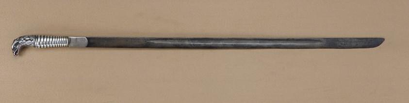 1850 – 1890’s Mexican officer’s sword with fancy silver grip and pommel showing eagle’s head, signed C. Zamora and two cartouches where silver ricasso meets the blade. The blade measures 28”, is almost straight in its manufacture, nearly 1” in width, with unusual blood groove that starts approx. 6” down the blade from the ricasso and extends approx. 16”. The sword is made without a guard, the blade is well tempered andsomewhat thick or sturdy and in good condition with some beginning pitting and erosion. The quality of the silverwork is very good and Zamora is well known to Mexican collectors for his silver work, particularly on spurs. Est: $750 - $1,500