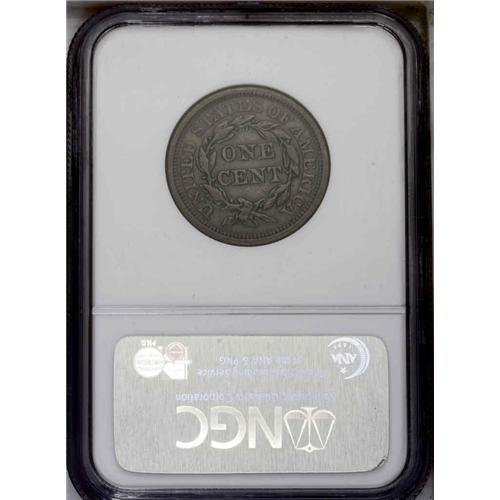 <B>1850<1C> N-11, High R.3. AU50 NGC. VF30 EAC.</B></I> Grellman state b. A scarcer variety identified by die rust lumps on the upper left part of the C in CENT and a pair of tiny die lines below the left upright of the N in ONE, except neither of those features are visible on this coin due to wear. A chocolate-brownish gray example that is well struck and modestly worn. An area of mushiness in the lower right obverse field, and on Liberty's neck, is likely the result of foreign material on the die.<BR><I>Ex: Harris (9/7/1969).</B></I> Envelope Included.