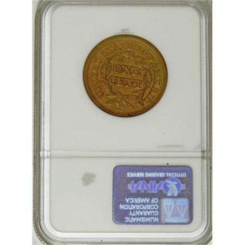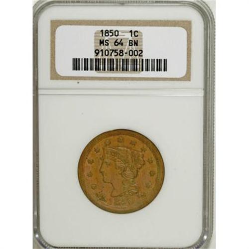 <B>1850 1C MS64 Brown NGC.</B></I> NGC Census: (137/140). PCGS Population (71/42). Mintage: 4,426,844. Numismedia Wsl. Price for NGC/PCGS coin in MS64: $256. (#1889)<BR><BR><B>Coin Engraver:</B> Christian Gobrecht<BR><BR><b>Shipping:</b> Coins & Currency (<a target="_blank" href="http://www.heritageauctions.com/common/shipping.php">view shipping information</a>)