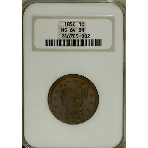 <B>1850 1C MS64 Brown NGC.</B></I> NGC Census: (135/139). PCGS Population (68/40). Mintage: 4,426,844. Numismedia Wsl. Price: $256. (#1889)<BR><BR><b>Shipping:</b> Coins & Currency (<a target="_blank" href="http://www.heritageauctions.com/common/shipping.php">view shipping information</a>)
