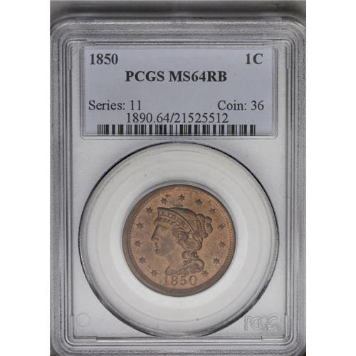 1850 1C MS64 Red and Brown PCGS. N-7, R.2. Grellman Di 1850[1C] MS64 Red and Brown PCGS.