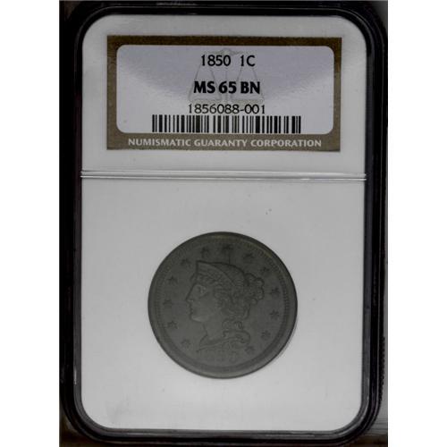<B>1850<1C> MS65 Brown NGC.</B></I> N-9, R.2. Deep golden-brown and cobalt-blue patination embrace this satiny and penetratingly struck Gem. Smooth fields and devices attest to the impressive eye appeal. EAC 60.