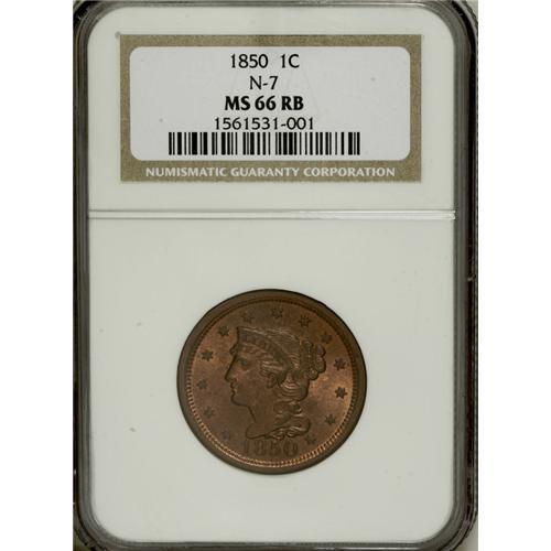 1850 1C MS66 Red and Brown NGC. N-7, R.2. A satiny fir