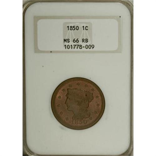 <B>1850 1C MS66 Red and Brown NGC.</B></I> N-7, R.2. Grellman Die State b. Slightly faded mint red is substantial, although the centers are partly medium brown. An unabraded and pleasing Premium Gem with a sharply struck portrait and softly brought-up stars. Certified in a former generation holder. EAC 63.<BR><BR><B>Coin Engraver:</B> Christian Gobrecht<BR><BR><b>Shipping:</b> Coins & Currency (<a target="_blank" href="http://www.heritageauctions.com/common/shipping.php">view shipping information</a>)
