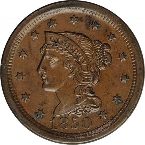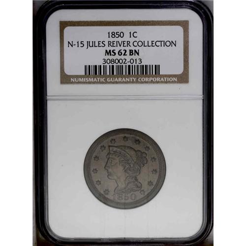 <B>1850<1C> N-15, R.1. MS62 Brown NGC. AU50 EAC.</B></I> Grellman state a. Sharply struck with light brown color and a few minor spots. Lighter tan and dark steel color is visible, with low areas on the reverse below CENT.<BR><I>Ex: George Ramont (10/10/1976).</B></I> Envelope Included.